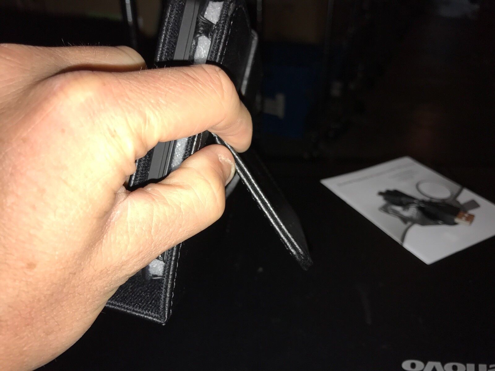 The Tablet Slides into a Made to Fit Sleeve Section which has all the Access Points for Volume / Ports Etc. This Sleeve also closes securely by a Velcro Strap which holds the Tablet firmly into Place.