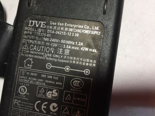 DEE VAN ENTERPRISE SWITCHING POWER SUPPLY DSA-0421S-12 3 30 11-13V 3.8A 42W