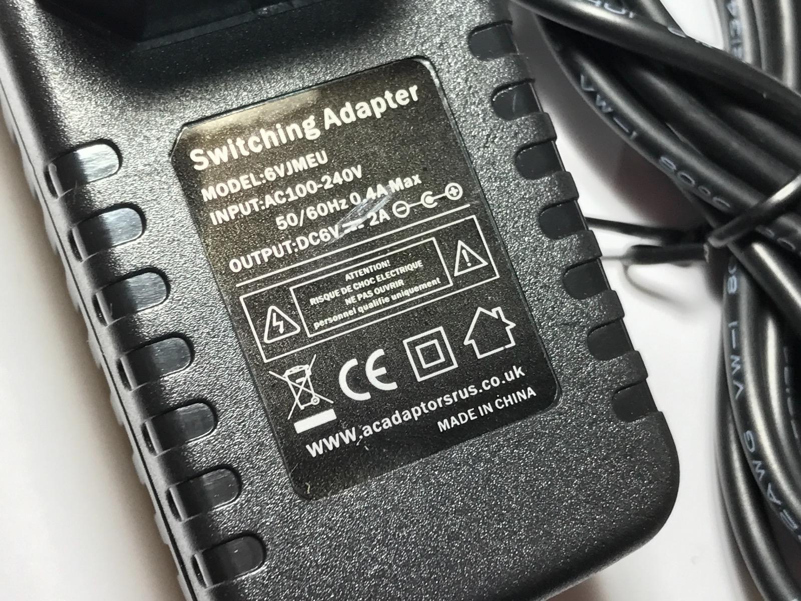 Input : 100-240v ac 50/60Hz Output: DC 6V - 2.0A (perfect for 2A and below) Total Lead Length = 1.5 Metres Red ON/OFF LED Indicator CE Certified EUROPEAN 2 PIN PLUG