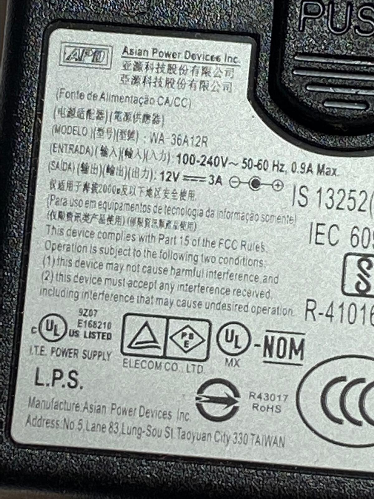 Genuine Asian Power Devices AC Adaptor Power Supply WA-36A12R 12V 3A Naked Plug