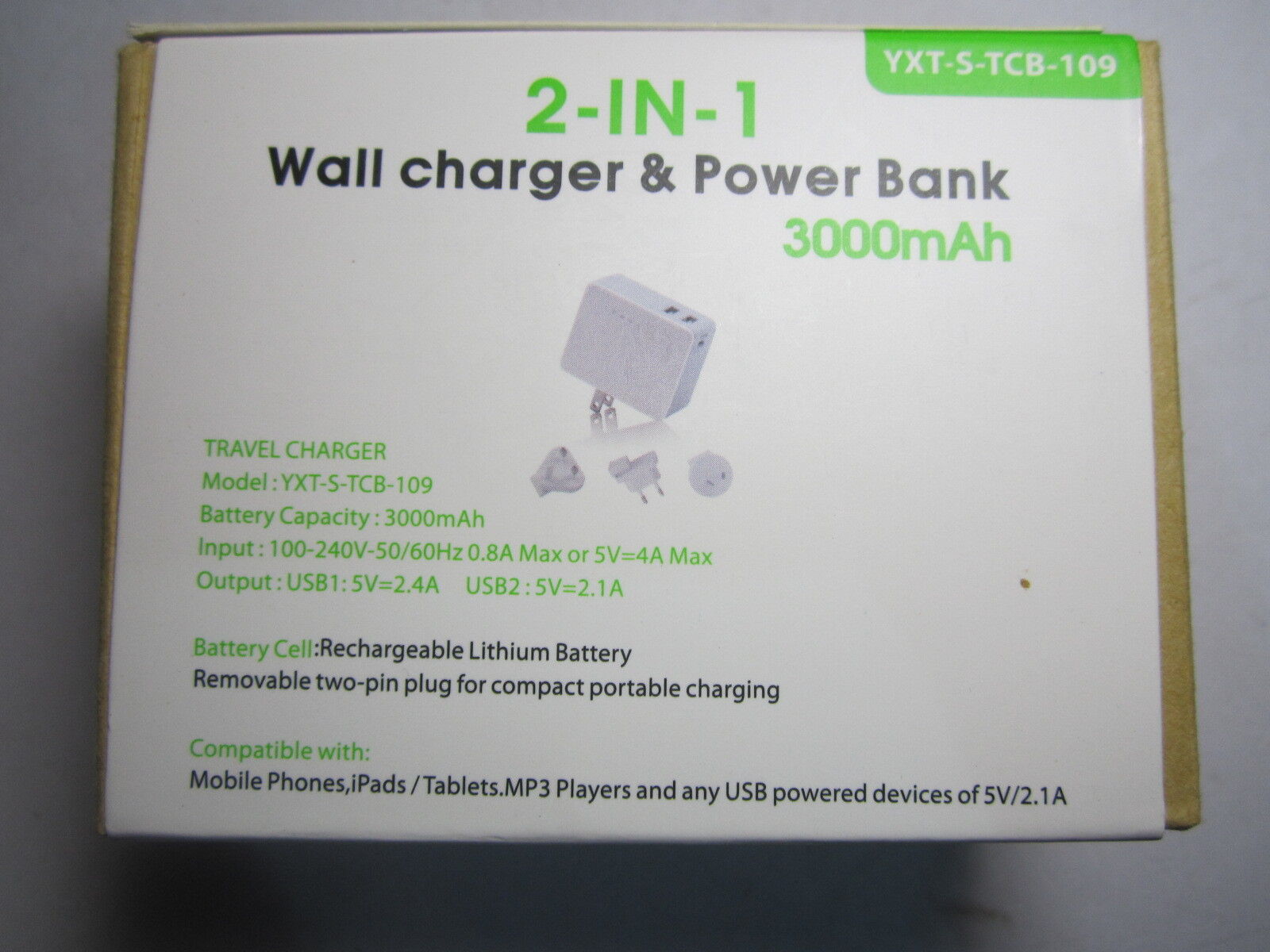 UK 5V 2.4A + 5V 2.1A Dual USB Mains Charger Adaptor + Power Bank 3000mAh Battery