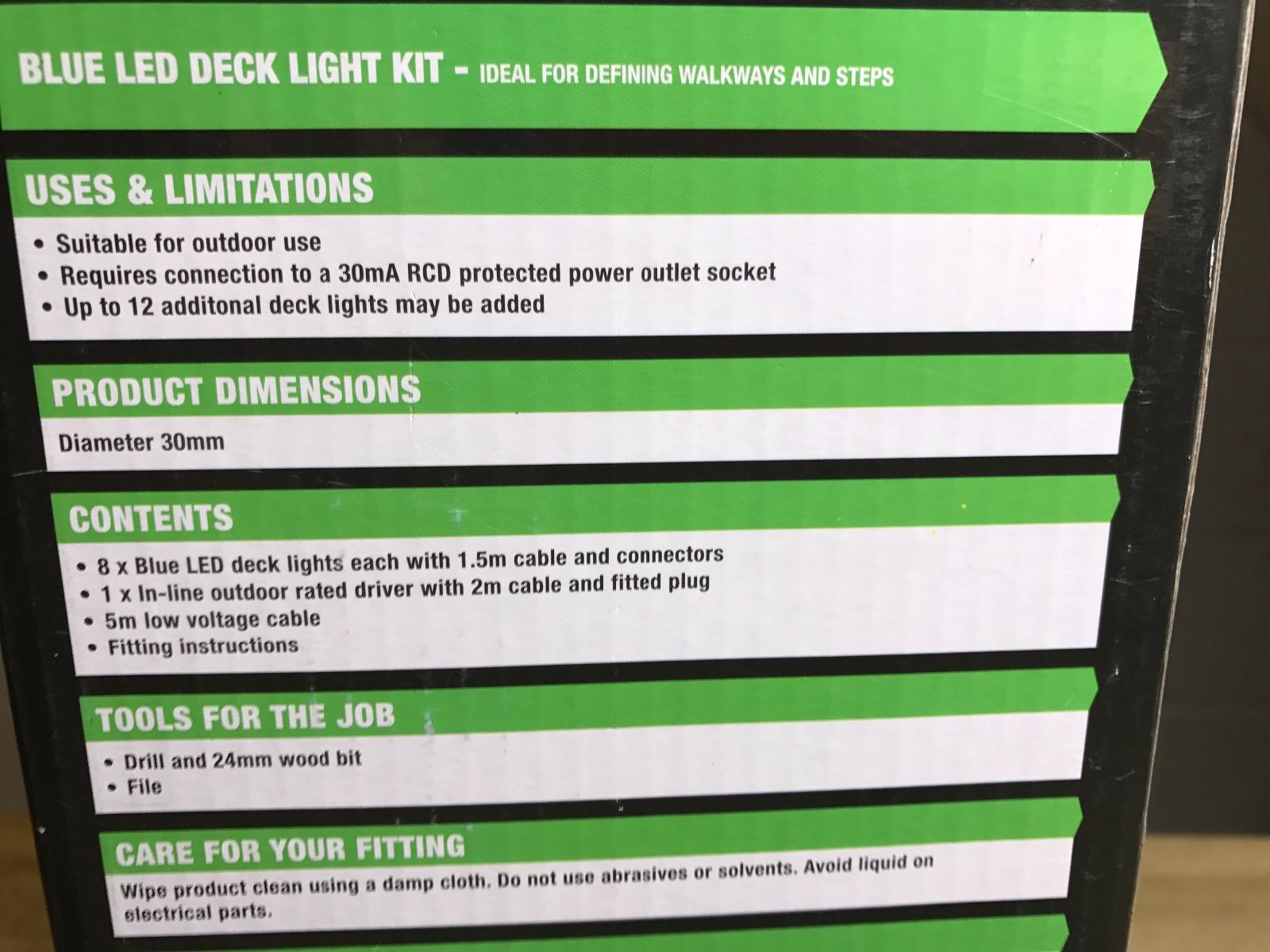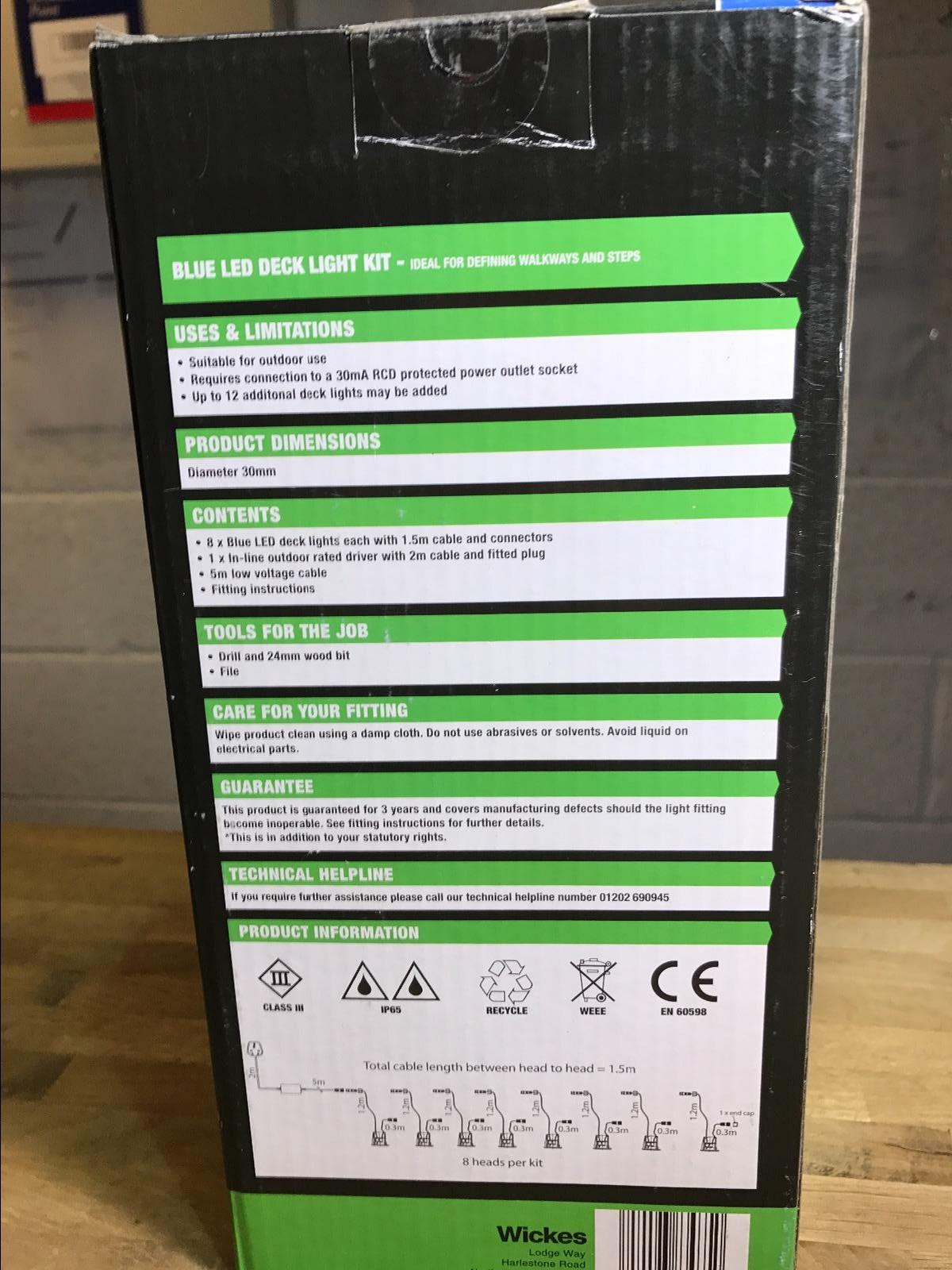 WICKES 8 X 30mm BLUE 12V LED OUTDOOR IP65 DECK DECKING LIGHT KIT 10.5M RUN
